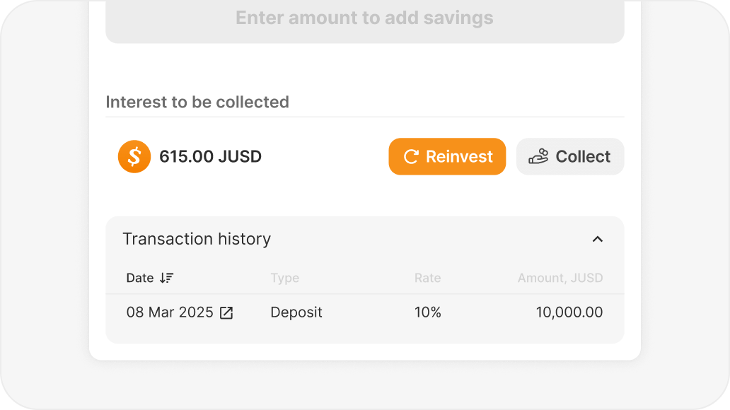 Connect your wallet with the JUSD App and deposit your JUSD into the Savings module to start earning a stable 10% APR — automatically, block by block.